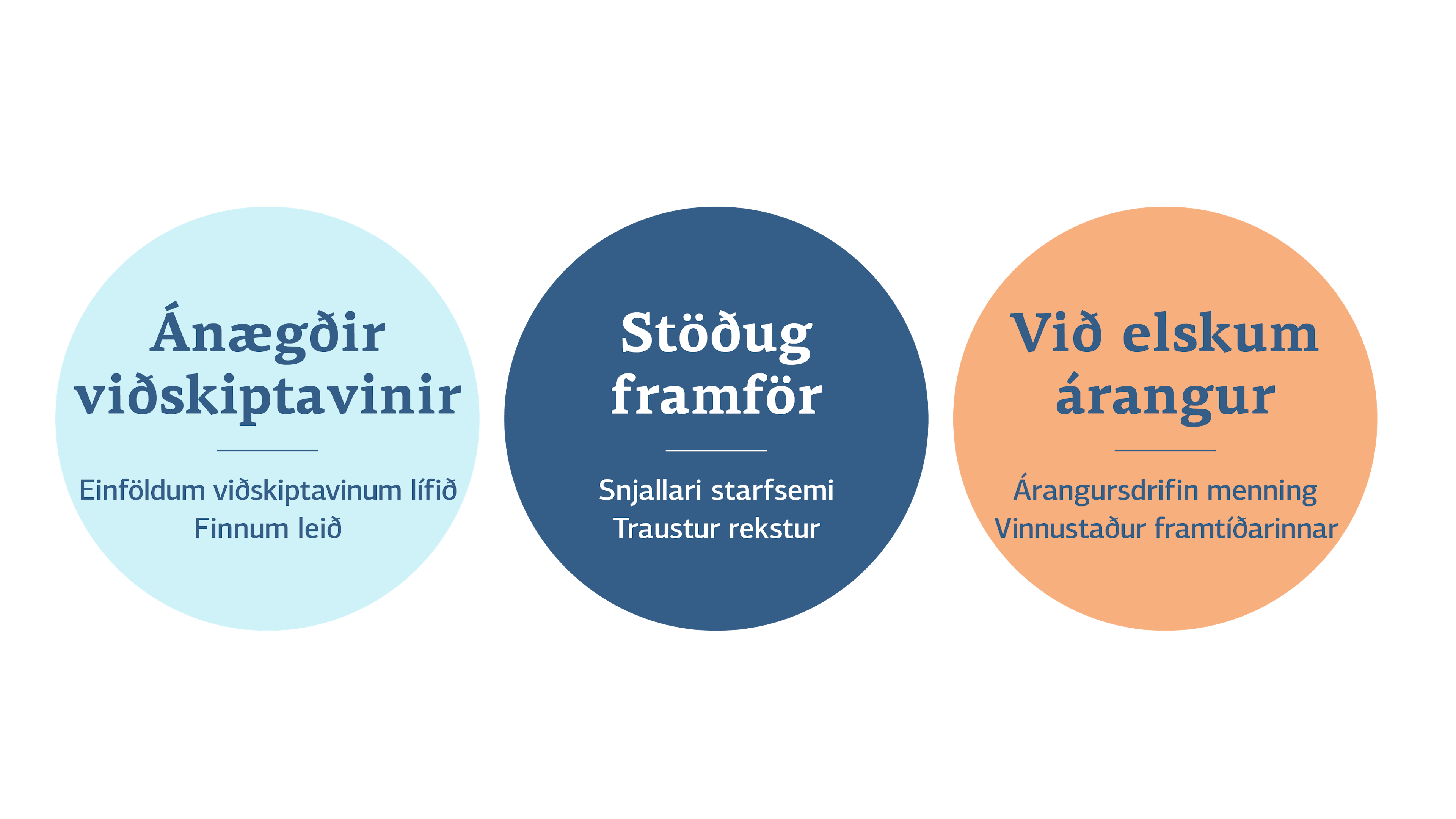 Stefnan er studd af þremur stoðum sem byggja upp þá grunnþætti sem nauðsynlegir eru til að ná framúrskarandi árangri. Stoðirnar snúast um ánægða viðskiptavini, stöðuga framför og árangur.