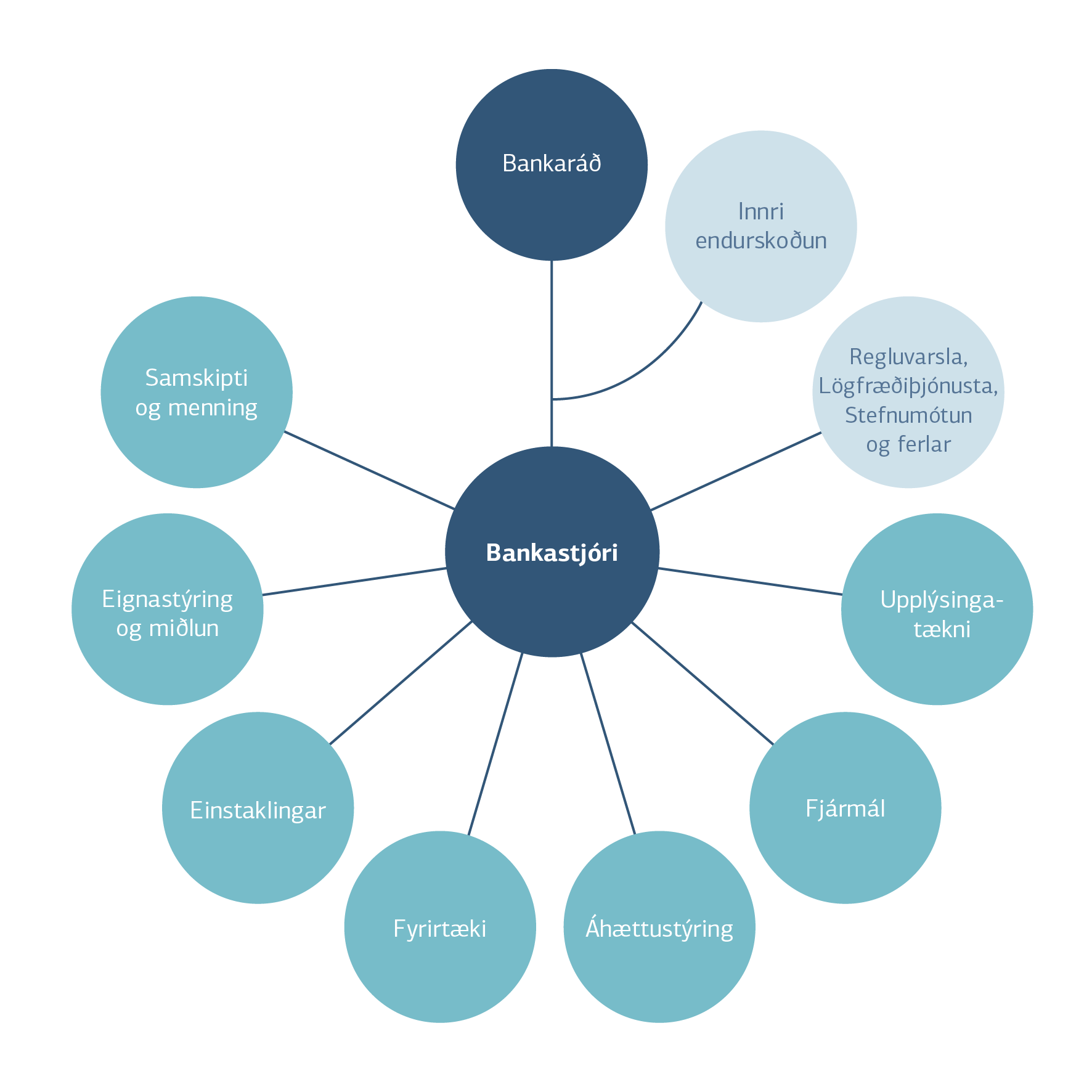Þvert á bankann starfa þrjár deildir sem heyra í skipuriti beint undir bankastjóra. Regluvarsla viðhefur áhættumiðað innra eftirlit með því að stjórnendur og starfsfólk starfi í samræmi við þær stefnur, reglur og ferla sem bankinn hefur sett sér. Lögfræðiþjónusta veitir lögfræðiráðgjöf til allra deilda og sviða bankans til þess að stuðla að því að bankinn starfi í samræmi við lög og reglur. Stefnumótun og ferlar styður bankastjóra við gerð stefnumótunar, viðskiptaáætlunar og framgang þeirra markmiða sem bankinn setur og viðheldur samræmdri sýn á starfsemina. Sameiginlegt hlutverk þessara eininga er að stuðla að skýrri mótun á stefnu bankans til framtíðar, efla góða stjórnarhætti og styðja við að bankinn starfi í samræmi við ytra og innra regluverk á hverjum tíma.